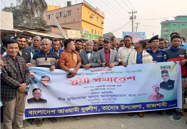 এই মিছিলে নেতৃত্বে দেন তানোর উপজেলার যুবলীগের সভাপতি ও তানোর উপজেলা পরিষদের চেয়ারম্যান লুৎফর হায়দার রশিদ। তিনি মিছিলের ব্যানার ধরে সামনের সারিতে ছিলেন। তাঁর পাশেই ছিলেন তানোর থানার ওসি কামরুজ্জামান। শুধু তা-ই নয়, ওসি কামরুজ্জামান যুবলীগের বহরের একটি গাড়িতে চড়ে তানোর থেকে বানেশ্বরে যান। এই বহরে ১৮টি মাইক্রোবাসে ১৪ জন করে নেতা-কর্মী ছিলেন। তাঁদের সঙ্গে ওসি ছিলেন। বিকেল সাড়ে চারটার দিকে তানোর যুবলীগের এই গাড়িবহরটি বানেশ্বরে পৌঁছায়। গাড়ি থেকে নেমে নেতা-কর্মীরা মিছিল নিয়ে বানেশ্বর সরকারি কলেজে মাঠে আয়োজিত ‘মাদক সন্ত্রাস ও জঙ্গিবাদবিরোধী সুধী সমাবেশে’ যোগদান করেন।