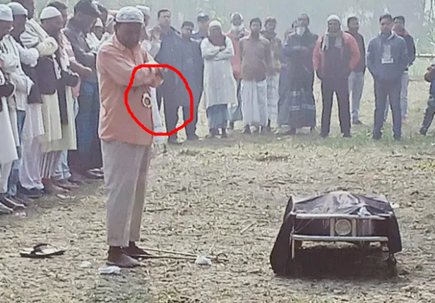 হাতকড়া ও ডান্ডাবেড়ি নিয়েই মায়ের জানাজার নামাজ পড়াচ্ছেন বিএনপি নেতা আলী আজম। মঙ্গলবার বেলা ১১টায় কালিয়াকৈরের পাবরিয়াচালা এলাকায়ছবি: সংগৃহীত