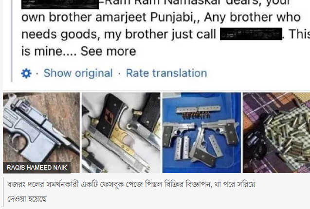 ওয়াল স্ট্রিট জার্নাল তাদের প্রতিবেদনে যে সাংবাদিকের কথা উল্লেখ করেছে, সেই রাকিব হামিদ নায়েক বিবিসি বাংলাকে জানিয়েছেন যে ২০২২ সালের এপ্রিল মাসে তিনি প্রথম লক্ষ্য করেন যে বজরং দলের সমর্থক একটি ফেসবুক পেজে পিস্তল আর দেশি পিস্তল, যাকে চলতি কথায় কাট্টা বলা হয়, সেগুলি বিক্রি করতে চেয়ে এক ব্যক্তি পোস্ট করেছেন।