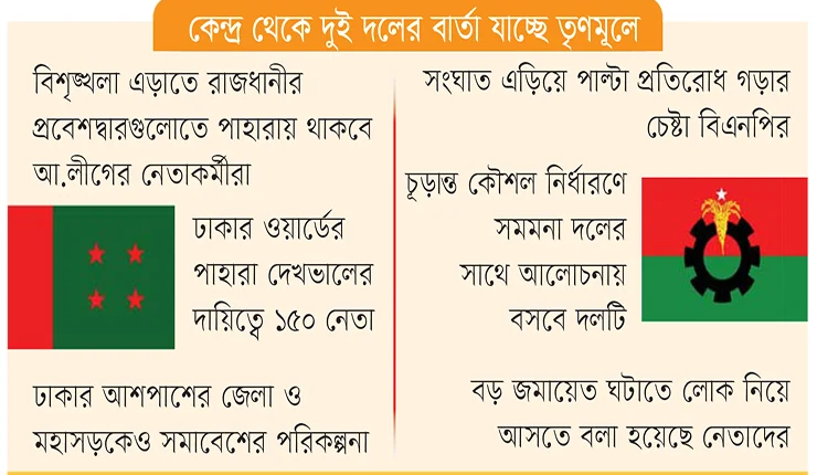 জানা গেছে, ১০ ডিসেম্বর ক্ষমতাসীন দলটিও ঢাকায় অবস্থান নেবে। এরই মধ্যে ঢাকা মহানগর আওয়ামী লীগ দক্ষিণের অধীন ৭৫টি ওয়ার্ডের প্রতিটিতে সতর্ক পাহারা বসানোর প্রস্তুতি নিচ্ছে। প্রতিটি ওয়ার্ডের সভাপতি ও সাধারণ সম্পাদকের নেতৃত্বে আওয়ামী লীগ, সহযোগী ও ভ্রাতৃপ্রতিম সংগঠনের নেতাকর্মী ও সমর্থকরা অবস্থান নেবেন। ঢাকা মহানগর উত্তর আওয়ামী লীগের অধীনে ৬৪টি ওয়ার্ড ও ১টি ইউনিয়ন আছে। প্রতিটিতে সতর্ক পাহারা বসানোর পরিকল্পনা চূড়ান্ত। এর বাইরে উত্তরের ২৬টি থানা কমিটিও তাদের নিজ নিজ থানার নির্দিষ্ট স্থানে অবস্থান নেবে। নেতৃত্ব দেবেন ওয়ার্ড ও থানা কমিটির সভাপতি ও সাধারণ সম্পাদকরা। সহযোগী ও ভ্রাতৃপ্রতিম সংগঠনগুলোও অংশ নেবে। ওয়ার্ড ও থানার অবস্থান দেখভালের জন্য মহানগর উত্তরের ৭৫ জন নেতাকে এলাকা ভাগ করে দেওয়া হয়েছে। একইভাবে মহানগর দক্ষিণকেও নির্দেশনা দেওয়া হয়েছে। এছাড়া প্রতিটি ওয়ার্ড ও থানা কমিটিতে ৩৭ জন নেতা রয়েছেন। তাদের প্রত্যেককে আরও ৫০ জন করে লোক নিয়ে আসার নির্দেশনা দেওয়ার কথাও জানা গেছে। সতর্ক পাহারার জন্য ঢাকার গুরুত্বপূর্ণ সড়কের মোড়গুলো বেছে নেওয়া হয়েছে। এসব মোড় কিংবা সড়ক এড়িয়ে কারও পক্ষেই নয়াপল্টনে বিএনপির সমাবেশে যাওয়া কঠিন হবে।